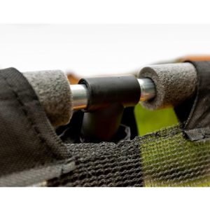 - Horní obruč trampolíny spojena se stojnami pomocí T-spojů; T-spoje přispívají ke stabilitě trampolíny a snazší montáži