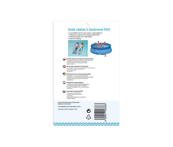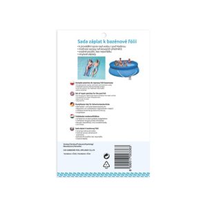 Sada záplat na bazénové folie. K provádění oprav nad vodou i pod hladinou. Možnost oprav i nafukovacích předmětů. Snadné použití bez nepořádku. Vinylové samolepící záplaty
