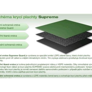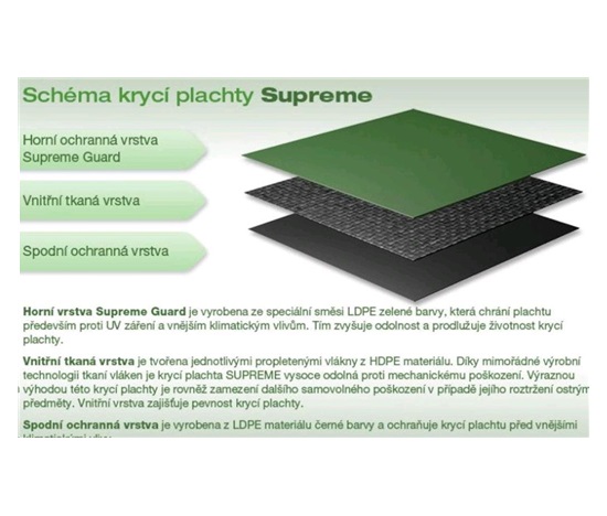 Díky použití ochranné vrstvy Supreme Guard je krycí plachta Supreme pevnější a lépe odolává povětrnostním vlivům – nejedná se ale o zimní plachtu a používání při teplotách pod bodem mrazu životnost krycí plachty snižuje.
