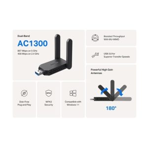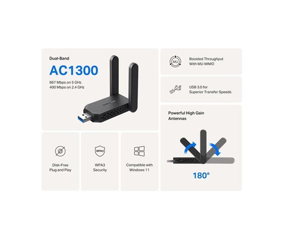 - Silná dvoupásmová Wi-Fi rychlost — Rychlosti až 867 Mb/s (5 GHz) + 400 Mb/s (2,4 GHz)