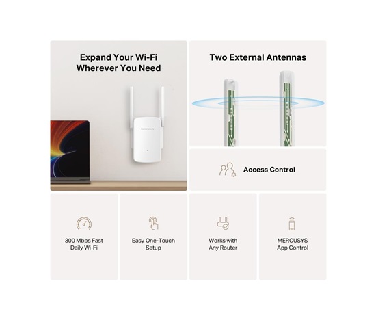 • 300 Mb/s každodenní Wi-Fi – Užívejte si rychlou a stabilní rozšířenou Wi-Fi kdekoli až do rychlosti 300 Mb/s, která vyhovuje potřebám vašeho každodenního života