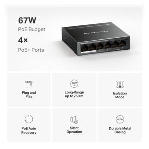 - 6 portů: 6× 10/100 Mbps RJ45 portů se 4 porty PoE+.