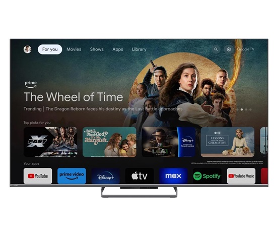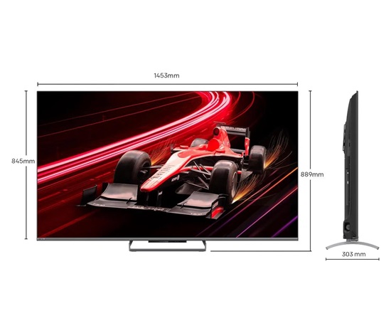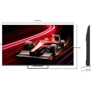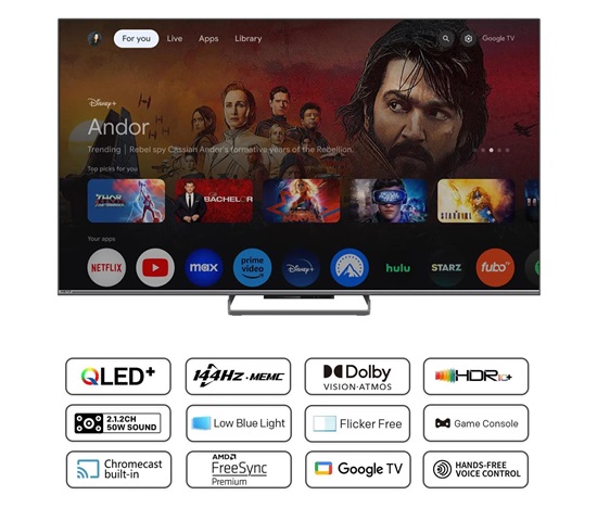 Google TV, QLED, 165cm, 4K Ultra HD, 100/120 Hz (144 Hz – herní režim), HDR10+, Dolby Vision, DVB-T2/S2/C, 3× HDMI, 2× USB, CI+, LAN, Bluetooth, Chromecast, herní režim, hlasové ovládaní, Google Assistant, párování s mobilním zařízením, Oneplay, VESA 400×200, Dolby Atmos, energetická třída F. Evropská distribuce.