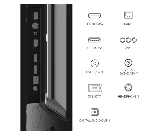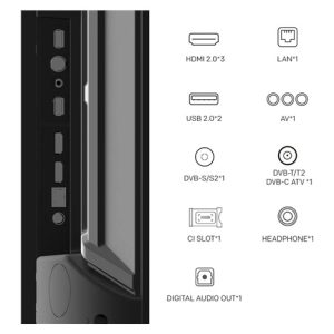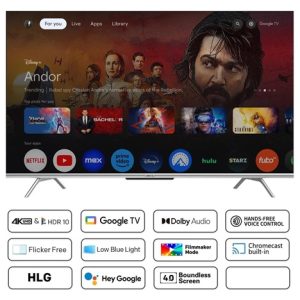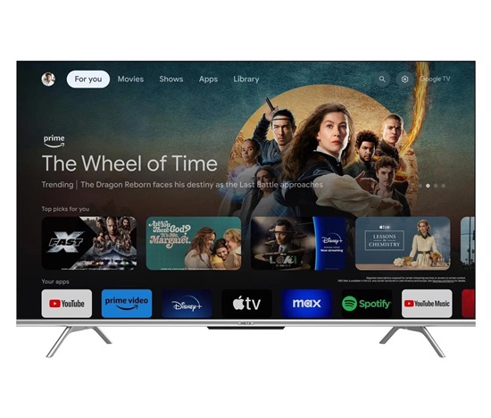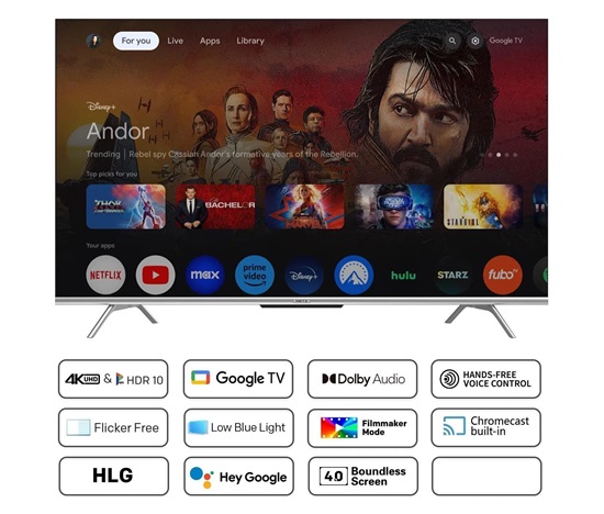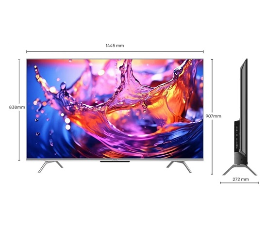 Google TV, LED, 165cm, 4K Ultra HD, 50/60 Hz, HDR10, DVB-T2/S2/C, 3× HDMI, 2× USB, CI+, USB nahrávání, LAN, Bluetooth, Chromecast, Miracast, herní režim, hlasové ovládaní, Google Assistant, párování s mobilním zařízením, Oneplay, VESA 400×200, DTS Studio Sound, energetická třída F. Evropská distribuce.