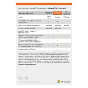 Předplatné Microsoft 365 (dříve známé jako Office 365) umožňuje ovládání nejen klasicky klávesnicí a myší, ale i prostřednictvím dotyku a stylusů, abyste byli na každém zařízení maximálně efektivní. Tato licence pro jednotlivce Microsoft 365 zahrnuje aplikace Word, Excel, PowerPoint, OneNote a další pro 1 osobu na rok (možnost nainstalovat až na 5 zařízení, ovšem vždy jedné osoby). K předplatnému dostanete také 1TB online úložiště OneDrive, abyste měli vaše důležité dokumenty zálohované a k dispozici, kdykoli a kdekoli potřebujete – na každém zařízení!