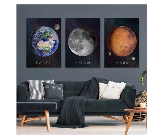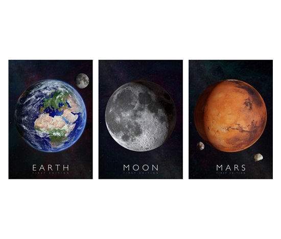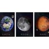 Balení obsahuje 3 plakáty: Země, Měsíc a Mars. Plakáty jsou vytištěny na odolném papíře ve velikosti A1 (594 × 841 mm).