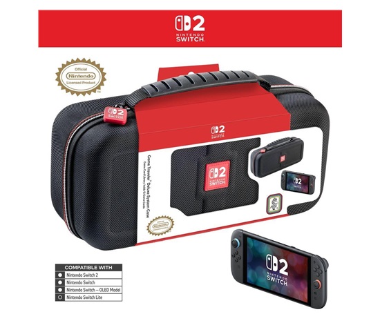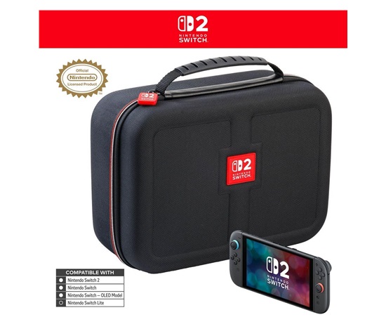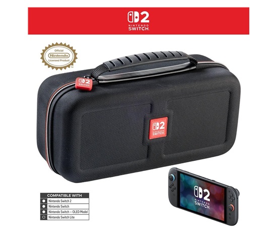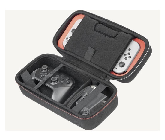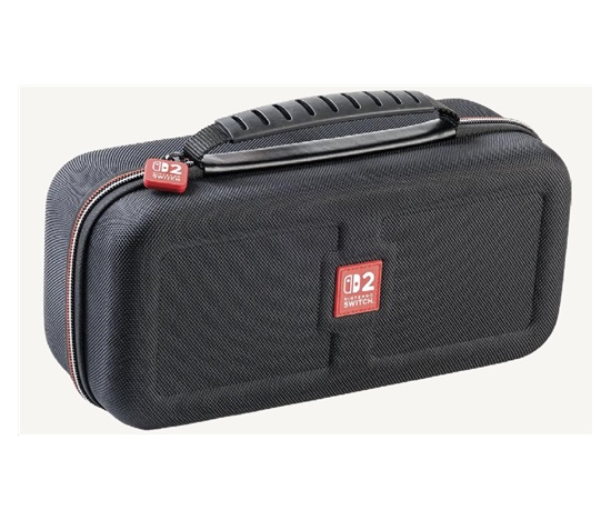 Toto větší přepravní pouzdro od společnosti Nacon oceníte, pokud budete chtít bezpečně a pohodlně přenášet svoji herní konzoli Nintendo Switch 2 včetně jejího základního příslušenství. Pouzdro pojme nejen samotnou konzoli, ale podle potřeby i dokovací stanici, nový ovladač Pro Controller nebo držák Joy-Con 2 Charging Grip. Zároveň nabízí také samostatnou přihrádku pro napájecí adaptér s kabelem a propojovací HDMI kabel. Nastavitelný stojánek v horní části pouzdra, při hraní umožňující pohodlněji sledovat dění na obrazovce, ochrání během přepravy jak obrazovku, tak i analogové páčky konzole a na jeho vnitřní straně navíc naleznete dvanáct kapsiček pro uložení herních karet. Součástí balení jsou pak také dvě menší plastová pouzdra pro microSD karty a čisticí hadřík s logem Nintendo Switch 2. Pouzdro je kompatibilní rovněž s konzolemi Switch a Switch – OLED Model, včetně jejich příslušenství.