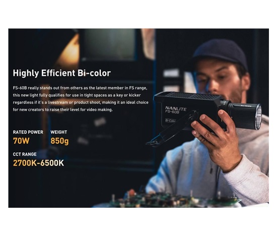 Model FS-60B je studiové světlo pro začátečníky, kteří chtějí něčeho dosáhnout jak ve fotografování, tak v natáčení videí – je to kompaktní dvoubarevné LED světlo, které za dané peníze nabízí vysokou hodnotu.