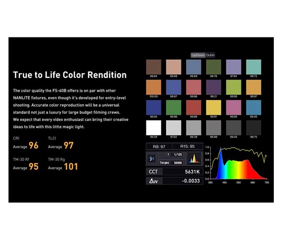 - Přesný a velmi barevný výkon podobný pokročilým světlům Nanlite