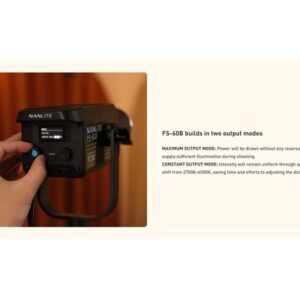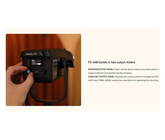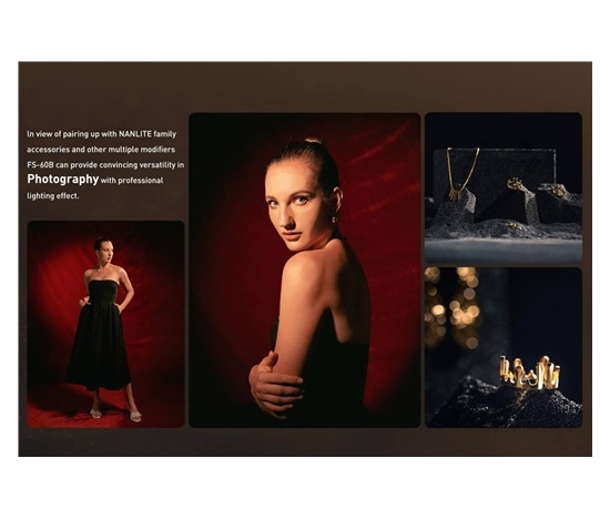 Model FS-60B má 12 vestavěných přizpůsobitelných efektů a dodává se spolu s adaptérovým bajonetem Bowens pro samostatně dostupné modifikátory světla.