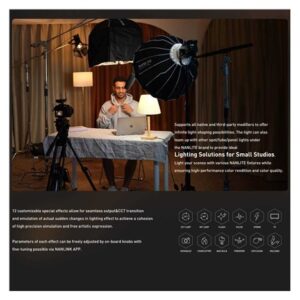 Nasviťte si své live streamy, videa a fotografie pomocí tohoto malinkého světla, které váží pouhých 0,87 kg. Toto kompaktní, výkonné a univerzální světlo má 45° reflektor, který nabízí výkon 6 228 lumenů. Ve vzdálenosti 1 metru vyzařuje 13 360 luxů světla vyváženého jako denní světlo s teplotou 5 600 K. Světlo má navíc rozsah barevných teplot 2700–6500K a vysoké indexy CRI/TLCI s hodnotami 96/97, což zajišťuje pokročilé a přesné podání barev. Dvoubarevné provedení světla poskytuje jak teplejší umělé tóny, tak chladnější tóny denního světla a zachovává přitom příjemné tóny pleti.
