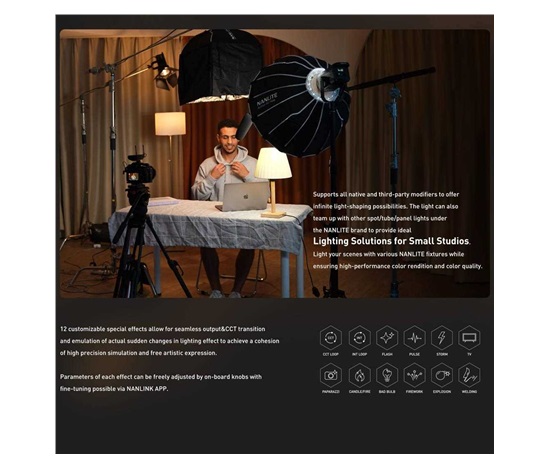 Díky předprogramovaným přizpůsobitelným speciálním efektům se se světlem FS-60B snadno simulují specifické a kreativní scénáře osvětlení. Světlo imituje 12 různých světelných efektů včetně CCT loop, INT loop, blesku, pulzů, bouře, televize, paparazzi, svíčky/ohně, vadné žárovky, ohňostroje, výbuchu a záblesků při svařování.