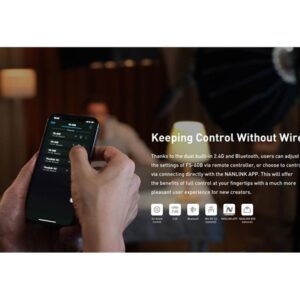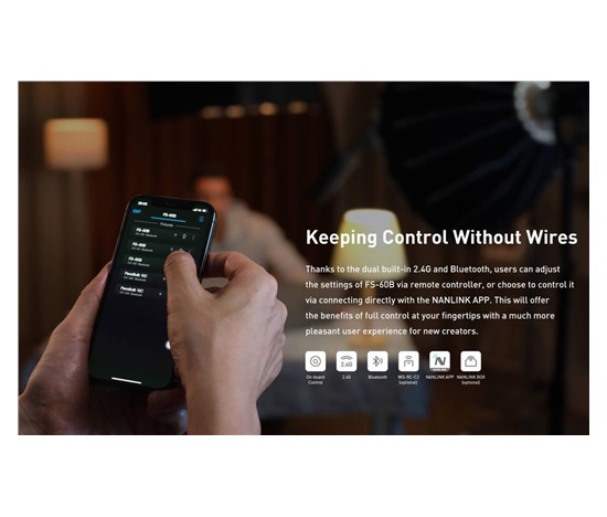 Model FS-60B je vybaven 1,3″ OLED displejem pro přímé, přesné a snadné ovládání. Lze jej ale také ovládat vzdáleně prostřednictvím Bluetooth a aplikace NANLINK, která je zdarma a je určena pro systémy iOS i Android, pomocí 2.4GHz připojení s využitím samostatně dostupného manuálního dálkového ovladače WS-RC-C2 nebo boxu vysílače WS-TB-1.