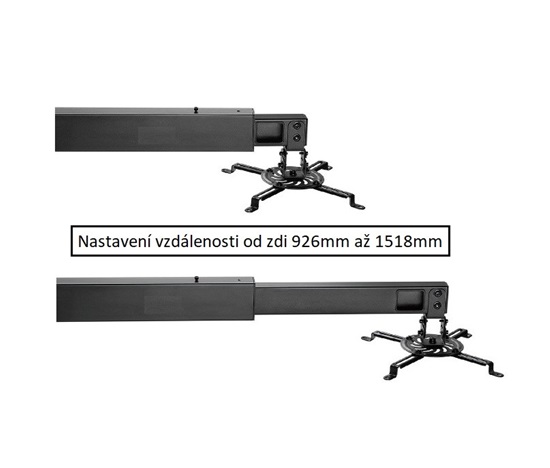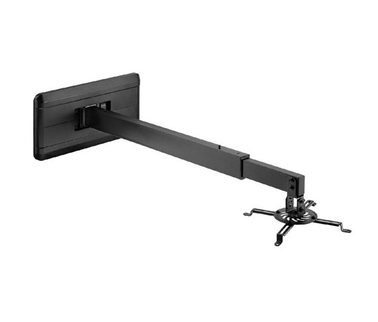 Kvalitní nástěnný držák na projektor. Nastavitelná vzdálenost od zdi 926mm až 1518mm, naklápění do stran +/- 15°, otáčení do stran +/- 180°, univerzální úchyt s roztečí 54mm až 320mm na 3 nebo 4 šrouby umožňuje uchycení naprosté většiny projektorů, nosnost 15kg. Držák má systém pro skryté vedení kabeláže, instalace a nastavitelnost jsou velmi snadné. Nástěnná instalační plocha o rozměrech 505x269mm zajišťují výborné rozložení hmotnosti a spolehlivé uchycení na zdi.