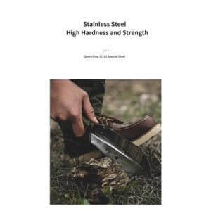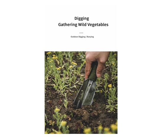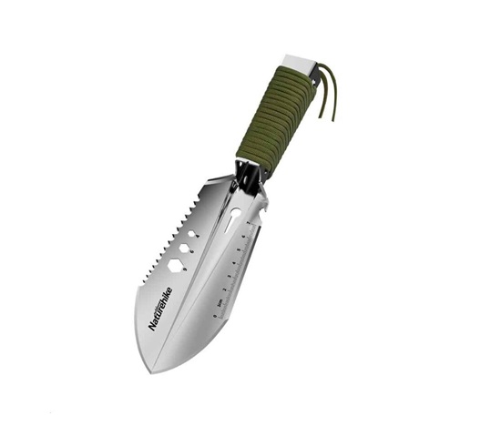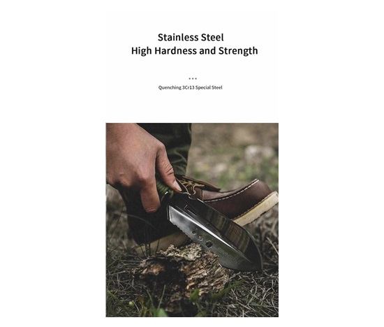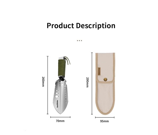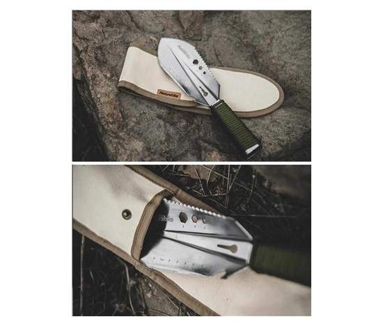 Universální lopatka z nožířské nerezové ocele 3Cr13 + pouzdro. V jednom kousku vybavení najdete lopatku, nůž, pilku, sekeru, což je to hlavní, jako bonus navíc je zde vytahovač hřebíků, otvířač lahví, měřidlo a klíč na matky. Použijete, všude tam kde si nechcete ničit svůj nůž, především při potřebě kopání ohniště, sekání proutků a dalších méně vybíravých čiností.