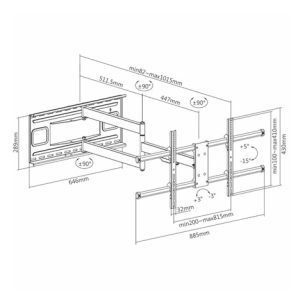 Nastavitelná vzdálenost od zdi 82mm až 1015mm, otočení kolmo ke zdi Tv s úhlopříčkou 43-80″, naklápění +5° až -15°, korekce roviny +/- 3°, podporuje VESA standardy 200×100 až 800×400, nosnost 50kg