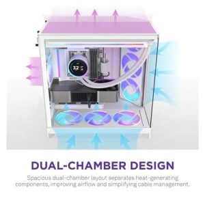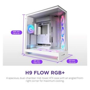 The H9 Flow is a spacious mid-tower ATX case built for high-performance builds, balancing airflow and aesthetics. Its dual-chamber design improves cooling and cable management, while perforated panels, angled fans, and ample fan and radiator support deliver optimal thermal performance.