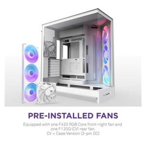 • Předinstalované ventilátory: Obsahuje jednu jednotku ventilátoru F420 RGB Core s jedním rámečkem v pravé přední části a jeden ventilátor F120Q (CV) v zadní části. CV = verze pro skříň (3-pin DC)