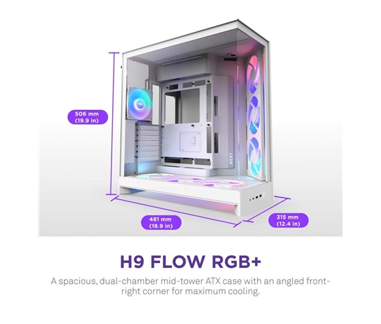 The H9 Flow is a spacious mid-tower ATX case built for high-performance builds, balancing airflow and aesthetics. Its dual-chamber design improves cooling and cable management, while perforated panels, angled fans, and ample fan and radiator support deliver optimal thermal performance.