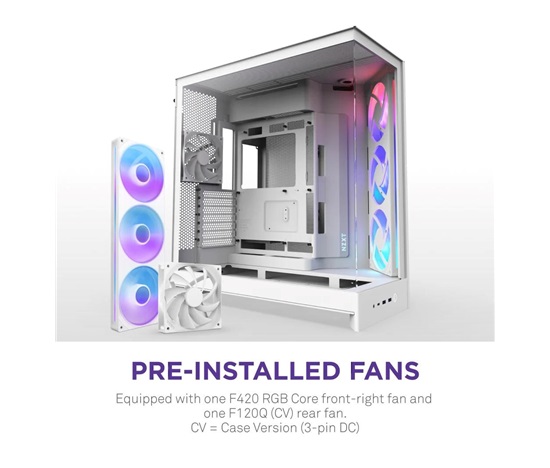 • Předinstalované ventilátory: Obsahuje jednu jednotku ventilátoru F420 RGB Core s jedním rámečkem v pravé přední části a jeden ventilátor F120Q (CV) v zadní části. CV = verze pro skříň (3-pin DC)
