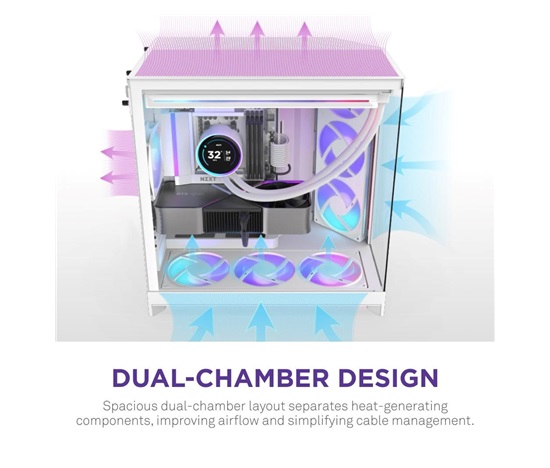• Dvoukomorový design: Odděluje hlavní komponenty od zdroje napájení a disků, čímž zlepšuje tepelný výkon a správu kabelů.