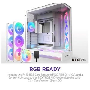 - Připraveno pro RGB: Obsahuje dva ventilátory F420 RGB Core v jednom rámečku, jeden ventilátor F120 RGB Core (CV) v zadní části a řídicí rozbočovač NZXT. CV = Case Version (3-pin DC)