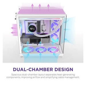 The H9 Flow is a spacious mid-tower ATX case built for high-performance builds, balancing airflow and aesthetics. Its dual-chamber design improves cooling and cable management, while perforated panels, angled fans, and ample fan and radiator support deliver optimal thermal performance.