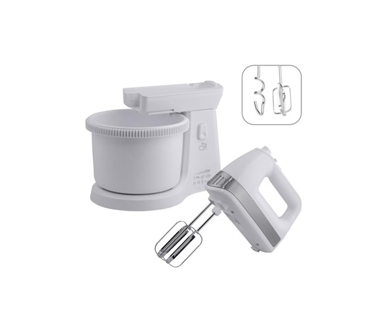 Elektrický ruční šlehač s otočnou nádobou, 5 rychlosti a funkce TURBO pro maximální výkon, 2,5 l otočná nádoba s mechanickým pohonem, Sada šlehacích metel a metel na hnětení, výklopné rameno, Napájení: 220 – 240V ~ 50 / 60Hz, 400 W
