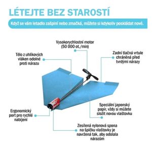 S modelem POWERUP 2.0 se obejdete bez pokročilých technických znalostí a funkční model motorizované vlaštovky zvládnou bez problémů složit i menší školou povinné děti. V balení naleznete předtištěné šablony, nicméně bez obav můžete využít i své vlastní designy. Jakmile máte vlaštovku hotovou, jednoduše na ni připevníte karbonovou osu s motorem a přiloženým nabíjecím boxem oživíte integrovaný superkondenzátor. Celá akce nabití zabere rovných 20 sekund, po kterých stačí vlaštovku s roztočenou vrtulí vypustit do prostoru a užívat si pohled na plynulý volný let. POZOR: Nikdy nenabíjejte déle než 20 sekund. Na většinu letů vám bude stačit 10s nabíjení.
