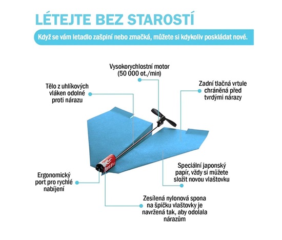 • Délka letu: Více než 30 sekund nepřetržitého plachtění na jedno nabití.