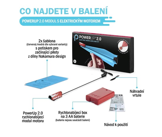 Uvnitř balení na vás čeká jedna pohonná jednotka PowerUp 2.0 doplněná o dvě papírové šablony, náhradní vrtuli, přenosný rychlonabíjecí box a podrobnou uživatelskou příručku. Je tak ideálním dárkem pro zvídavé letce.