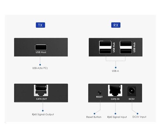 – 1 x vzdálený extender konektory: 4xUSB typ A Female, RJ45 Female, konektor pro napájení