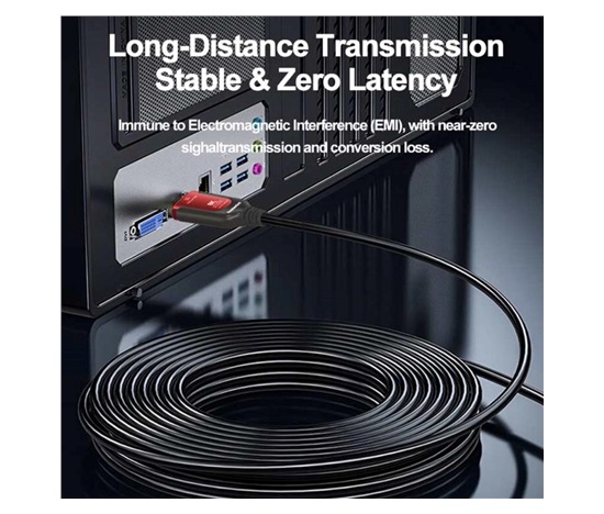 – Optický AOC kabel se vyznačuje vynikajícím přenosem signálu na velké vzdálenosti beze ztrát, je odolný proti elektromagnetickému rušení a dává nejlepší možný obraz ve srovnání s metalickými kabely