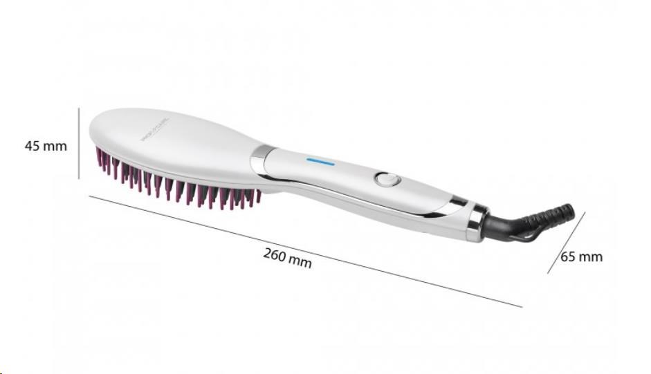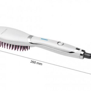 Elektrický žehlicí hřeben se SuperGlide keramickými štětinami vhodnými pro všechny typy vlasů. Během česání se vlasy rovnou žehlí. Hřeben je vybaven ionizační funkcí pro vytvoření antistatického efektu, díky kterému se vlasy nevysušují a stávají se hebkými a lesklými. Díky výkonu 37 W se hřeben rychle zahřeje a je tak během krátké chvíle připraven k použití. Zapíná a vypíná se jediným tlačítkem. Napájecí kabel je tepelně odolný a k hřebenu je připojen pomocí otočného kloubu. Manipulace s ním je tak pohodlnější. Pro uložení hřebenu slouží závěsné oko. Napájení je 110-240 V, 50/60 Hz.