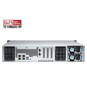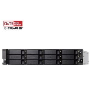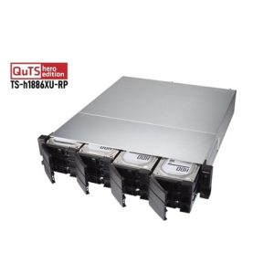 Zařízení TS-h1886XU-RP R2 2U s montáží do racku má dvanáct 3,5″ diskových pozic SATA 6Gb/s, šest 2,5″ slotů SATA 6Gb/s SSD, podporuje konektivitu 10GbE a čtyř 2,5GbE a je vybaveno čtyřjádrovým procesorem Intel Xeon D-1622 s pamětí až 128 GB DDR4 ECC (Error Correcting Code). S operačním systémem QuTS hero na bázi ZFS dosahuje TS-h1886XU-RP R2 výkonu serverové třídy a vysoké spolehlivosti. Ať už jde o souborové servery s kritickým významem, virtualizační servery, kolaborativní úpravy videí nebo efektivní aplikace pro zálohování a obnovu dat, zařízení TS-h1886XU-RP R2 s tříletou zárukou nabízí vysoce výkonné a zároveň cenově výhodné řešení NAS.