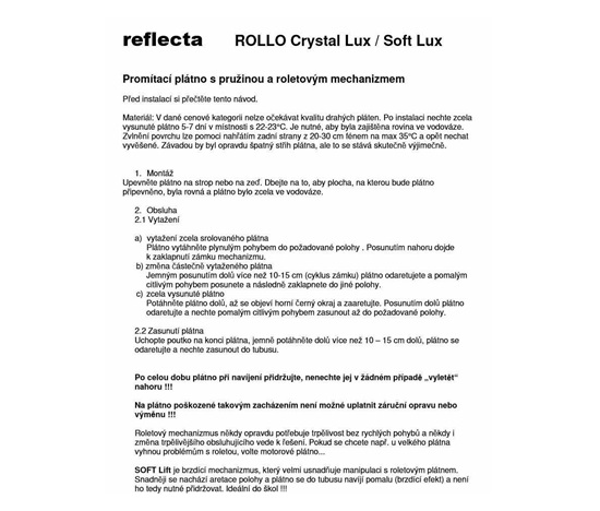 Roletové plátno ROLLO CrystalLine 240x175cm, viditelná plocha 236x133cm, 16:9, 107″/271cm, bílý hranatý kovový tubus 7x255cm/10kg, uchycení na stěnu nebo strop, materiál BetaLux – bílá 0,35 tkanina 300g/m2 s 2cm černým okrajem a zadní stranou, Gain=1,0, pozorovací úhel 120°. Lux – bílý matný povrch pro maximálně věrný a kontrastní obraz při alespoň částečném zatemnění. PVC materiál s textilním základem vytváří rovnou plochu bez zvlnění ale v krajích může docházet k prohnutí – postupně mizí. Snadné uchycení 4 vruty na plastových bocích plátna – stěna nebo strop. Možnost aretace polohy plátna při každé otáčce mechanizmu. Pozor při zpětném navíjení plátna je nutné plátno přidržovat – nesmí dojít k rychlému navinutí, které při nárazu na tubus může poškodit vnitřní mechanizmus bez možnosti uplatnění záruční doby.