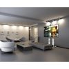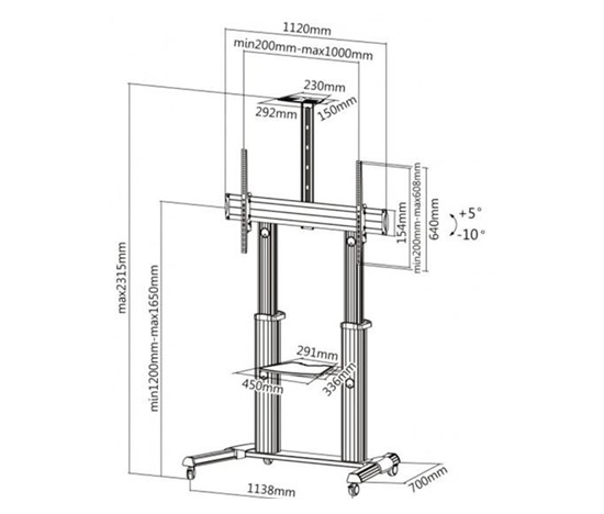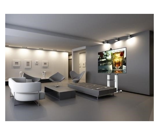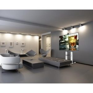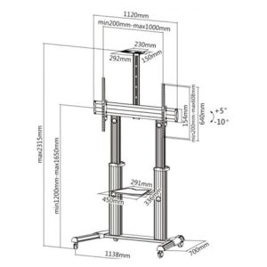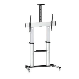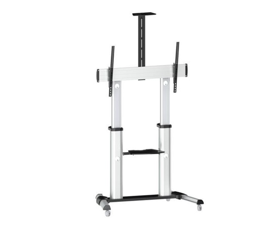 Moderní televizní stolek na Plasma a LCD TV s uhlopříčkou 60″- 100″ (152-254cm) a hmotností maximálně 100kg. 2x teleskopická nosná tyč na kolečkách, držák otočný o 90° a vertikálně výklopný +5°/-10°, horní výškově nastavitelná plocha pro kameru, polička, AluDesign, barva stříbrná. Uchycení VESA: 200×200, 300×300, 400×200, 400×400, 600×400, 800×400, 800×600, 1000×600.