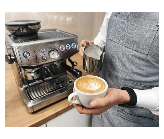 Za skvělou kávou již není potřeba pospíchat do kaváren ani restaurací. Kávu si za pár minut zvládnete udělat sami zkrátka ve vlastním kávovaru. Populární ruční pákový presovač SAGE SES876BSS Espresso s příkonem 1850 W vám z právě namletých kávových zrn sotva se rozkoukáte vytvoří dokonale vyvážené presso i latté nebo cappucino. Pochutnáte si tak na kávě jako z kavárny pěkně u vás doma. Pokud jsou vaše nejoblíbenější mléčné kávy, jako je cappuccino nebo caffe latté završené jemnou pěnou, bude se vám hodit vysokotlaká napěňovací tryska, která dokáže s mlékem zázraky. Nelze zapomenout na integrovaný mlýnek kávy, který kávu pomele tak nahrubo, jak si sami zvolíte. Neměli byste opomenout ani jeho rozměry 38 × 33 × 41 cm. Hmotnost tohoto modelu se vyšplhala na 9,7 kg. Zásobník vody dokáže pojmout 2 l, s tímto objemem presovač Sage si hravě poradí i s několika milovníky kávy po sobě. Konečný vzhled přístroje má na starosti nerez. Pro jeho zhotovení výrobce zvolil materiál, kterým je nerez.