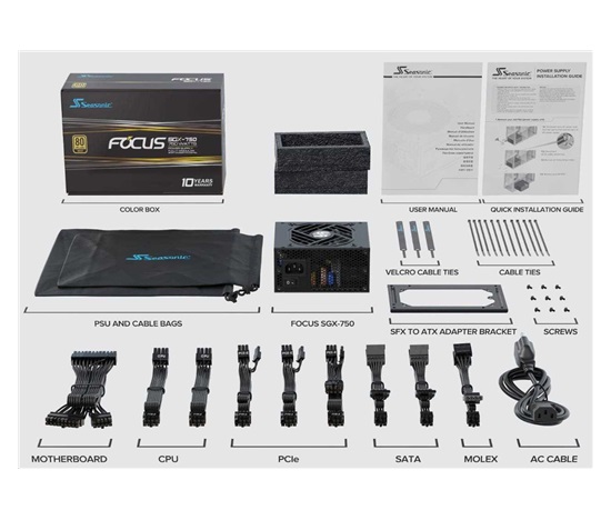 The new line of Seasonic’s FOCUS SGX is versatile in its application and powerful with a small footprint. It is a standard SFX unit, measuring at 125 mm (L) x 100 mm (W) x 63.5 mm (H). The FOCUS SGX (2021) is shipped with an SFX to ATX adapter bracket in the box, which allows the power supply to be mounted not only in the SFX form factor chassis, but also a standard ATX chassis should the user prefers to reserve more space for airflow inside the PC case. The Seasonic hybrid fan control is always enabled to optimize the cooling according to necessity.