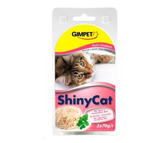 Shiny Cat – lahůdkové, čistě masové konzervy – pouze přírodní, směs kuřete a kraba. V konzervě je vidět najemno nakrájené kuřecí maso a krabí maso.