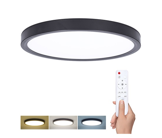 LED stropní svítidlo Estela v černém tenkém provedení je ideálním řešením pro moderní interiéry. Díky dálkovému ovladači můžete plynule regulovat jas, měnit barevnou teplotu světla (3000K–6500K) a volit mezi přednastavenými režimy. Maximální příkon 36W a světelný tok až 2700 lm (při 4000K) zajišťují dostatek světla pro každodenní použití.
