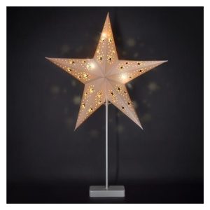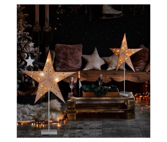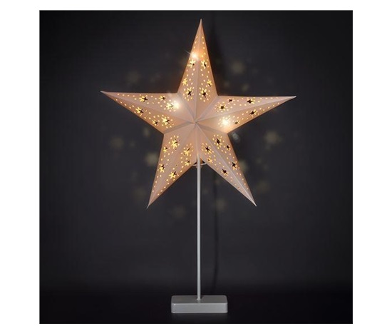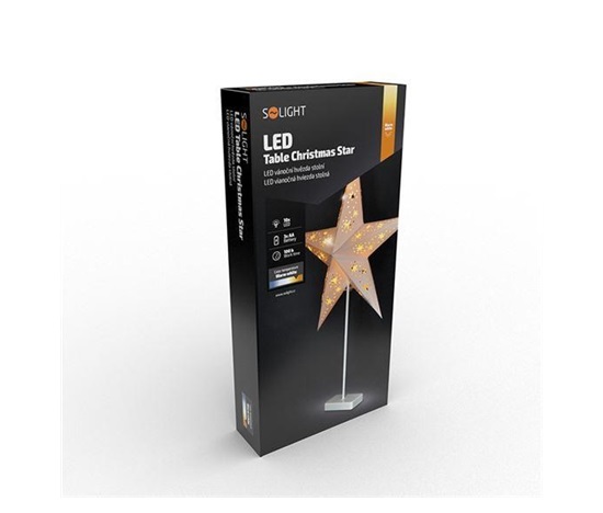 Vánoční hvězda se stojánkem a s řetezem s LED diodami, počet LED diod: 10, barva světla: teplá bílá (žlutá), napájení: 3 x AA baterie (nejsou součástí), výdrž baterií: cca 100hodin (v závislosti na kvalitě baterií), stupeň krytí: IP20 (vnitřní použití)