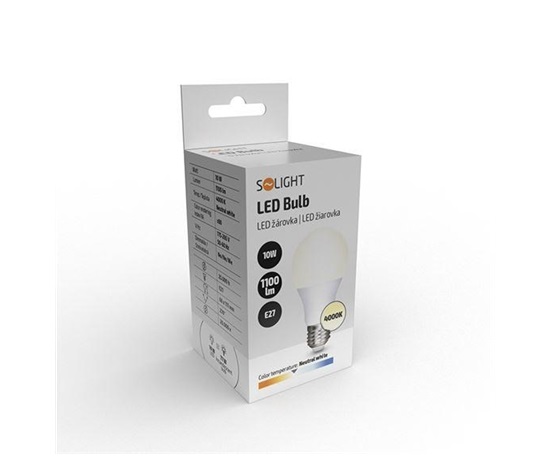 LED žárovka s klasickým tvarem, spotřeba: 10W, světelný tok: 1100lm (odpovídá tradiční 77W žárovce), teplota chromatičnosti: 4000K (neutrální bílá), životnost LED: 25.000 hodin