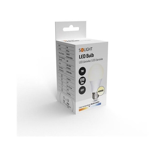 LED žárovka s klasickým tvarem, spotřeba: 7W, světelný tok: 810lm (odpovídá tradiční 60W žárovce), teplota chromatičnosti: 4000K (neutrální bílá), životnost LED: 25.000 hodin, počet spínacích cyklů: 20.000x