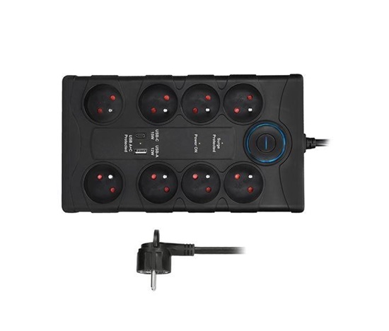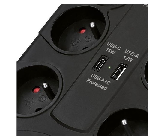 - LED indikace Přepěťová ochrana aktivní, Zásuvky 230V chráněny, USB A + C porty chráněny