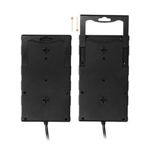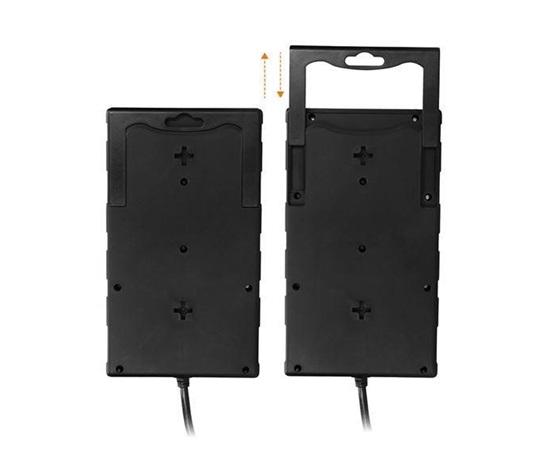 Robustní, dva metry dlouhý přívodní kabel poskytuje flexibilitu při umístění. Dvě oddělené zásuvky pojmou i větší napájecí adaptéry bez překážení ostatním zásuvkám. Výsuvný držák na zadní straně slouží k uspořádání kabelů, případně k zavěšení nebo přenášení. Nechybí ani montážní otvory pro pevné uchycení.