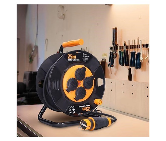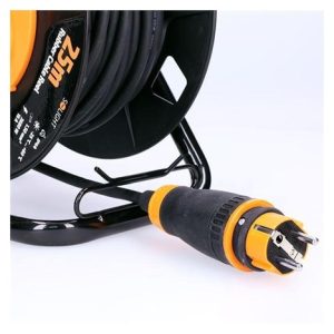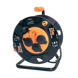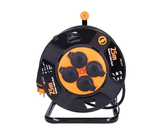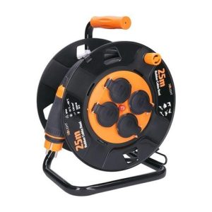 25m gumový kabel na bubnu z odolného plastu a čtyřmi zásuvkami je ideální pro použití venku, na zahradách, stavbách nebo v dílnách. Bytelná konstrukce s krytými zásuvkami i kabel samotný jsou odolné proti povětrnostním podmínkám a mechanickému namáhání.