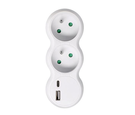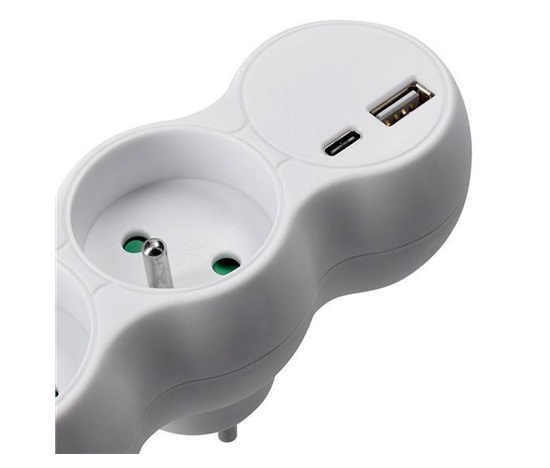 Výstup 2 x 10A/230V =>max. 16A, USB nabíjecí adaptér 2,4A max., USB výstupy 1x Typ-A + 1x Typ-C, dětská pojistka, barva: bílá