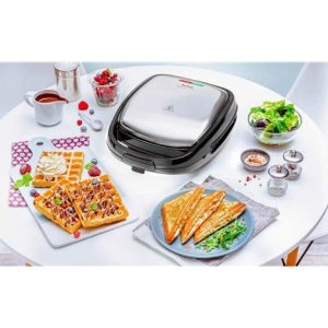 Tefal Snack Time 2 v 1, multifunkční přístroj s kovovou vložkou pro přípravu trojúhelníkových toustů a vaflí, představuje jedinečné řešení, které spojuje sendvičovač a vaflovač pro vždy dokonale sladké i slané chuťovky. Navíc jeho kovový vzhled dodá výrobku prémiový design.
