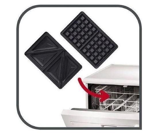 Údržba desek toustovače Tefal Snack Time SW341D12 2v1 je naprosto jednoduchá. Jsou vybavené nepřilnavým povrchem a navíc je můžete mýt v myčce nádobí.